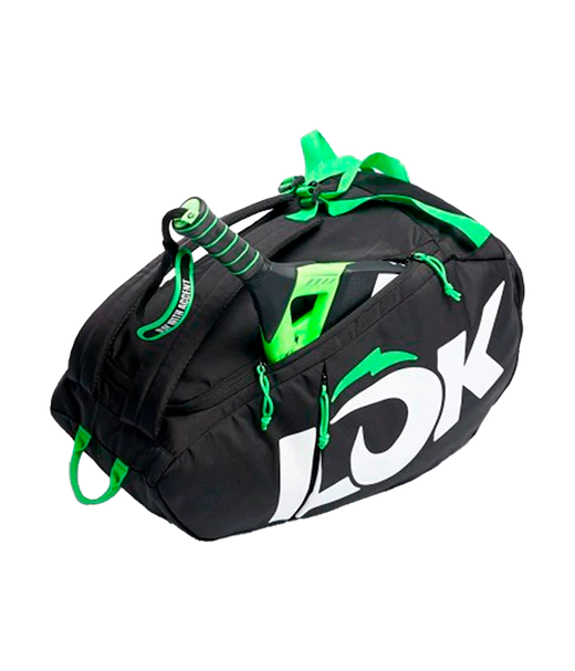 The Racket Bag One Black, designed to impress. Made with a large central pocket, a racket pocket, and several smaller pockets.