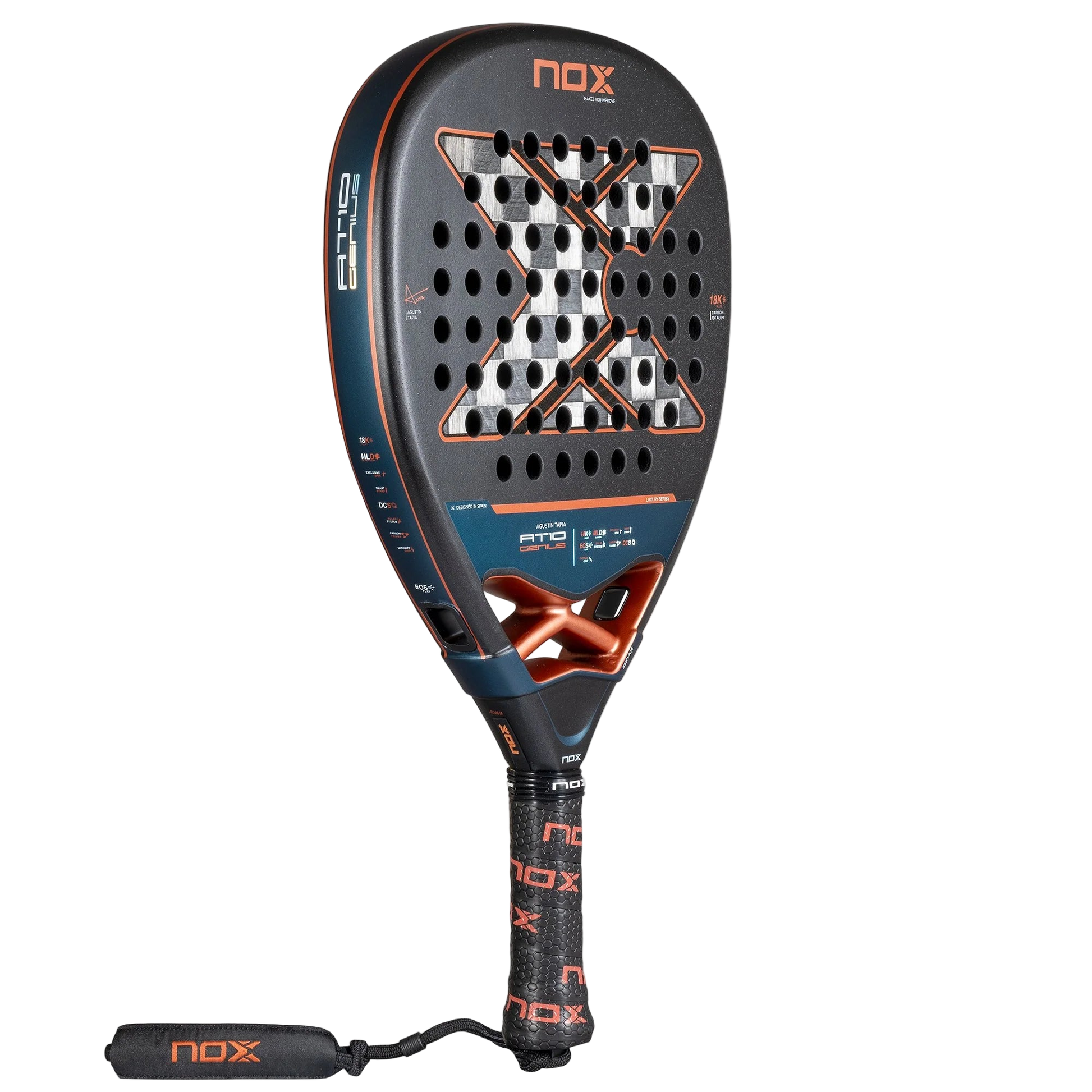The Nox AT10 Luxury Genius Attack 18K Alum 2025 By Agustin Tapia Racket, is the one chosen by the player Agustin Tapia for the 2025 season, it is an improved evolution of the AT10 Luxury Genius 18K Alum racket thanks to its perfect balance and unstoppable speed, a combination of materials has also been incorporated into the racket which are 18K carbon fiber in the frame and Black MDL Eva rubber core which makes the racket harder and more aimed at players looking for power in their game.